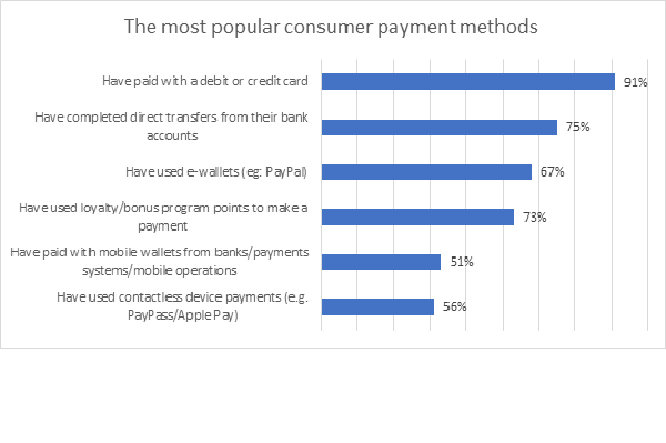 The wide range of digital payment methods gives shoppers the freedom to choose their favorite way of buying goods or services. The most preferable method is still debit and credit cards, direct transfers from bank accounts and e-wallets, e.g. PayPal. However, other payment methods are growing in popularity. Frequent shopping allows people to collect points via loyalty programs and use them when revisiting a retailer to buy more. And thanks to smartphones and smartwatches, consumers don’t even need to carry around their wallet, physical money or even plastic cards. This has helped to raise the popularity of contactless device payments, such as PayPass and Apple Pay, with a third of shoppers (50%) using them regularly.