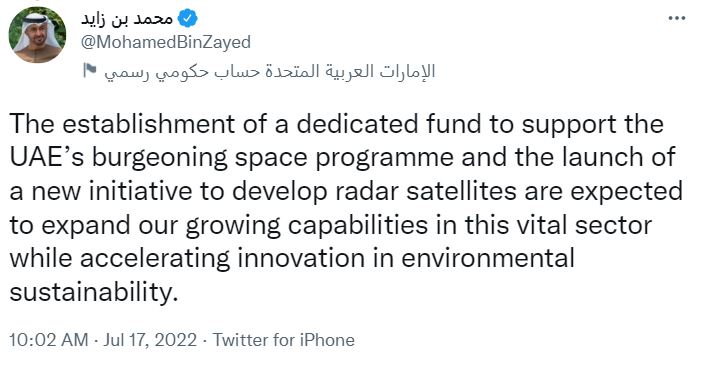 According to the tweet, the new fund will help "develop radar satellites that are expected to expand the UAE's growing capabilities in this vital sector while accelerating innovation in environmental sustainability".