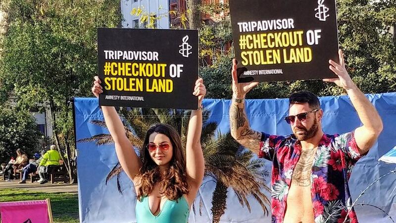 "We're here to advise TripAdvisor that they need to check out of the illegal Israeli settlements," Kate Allen, Amnesty's UK director, said.