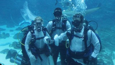 Casey, a marine biologist, retrieved her own diving equipment from home and returned to film part of the underwater nuptials.