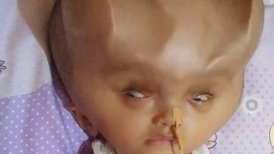 But parts of his skull collapsed where his brain hadn't formed, leaving ridges on his head that resemble devil horns.
