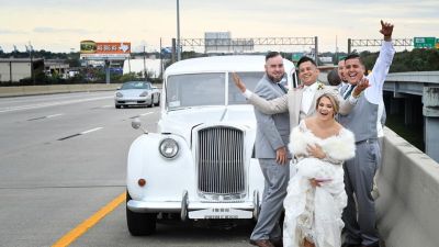 Jake and Amber Garcia said they were riding to their wedding reception in a 1966 "princess car" when the vehicle broke down on the freeway in Houston.