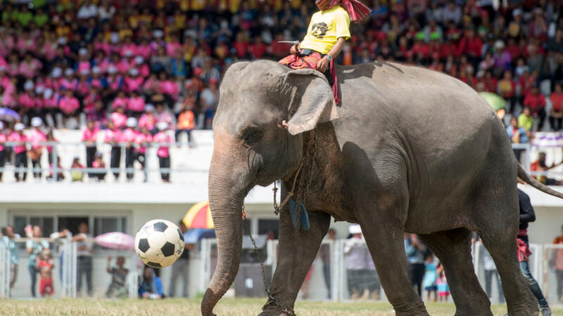Colourful Elephant Herd Taking Part in World Cup Pitch Against Thai Schoolboys