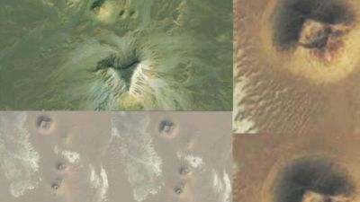 Mysteriously, when zooming in on the top of the triangular formation, two circular, 20-foot-wide features appear almost in the very centre of the triangle.