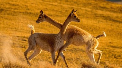 'Suddenly, in the middle of the road, a vicuna crosses the sandy path and begins a territorial fight with another one.'