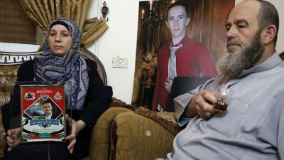 Abdul Fatah al-Sharif and Raja, grandfather and mother of Abdul Fatah who was shot dead by Israeli soldier Elor Azaria while lying wounded on the ground in 2016/ AFP