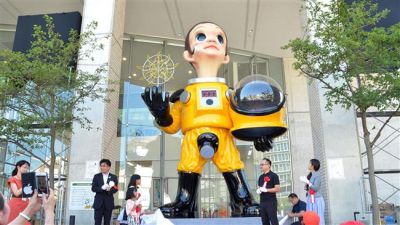 "I wanted to make a work that encourages people ... and made the statue of a child standing up bravely and strongly against any difficulties it faces," he said. "The clothing looks like protective gear, but it is also armor to confront major issues and, being like a space suit, it also carries a futuristic image."