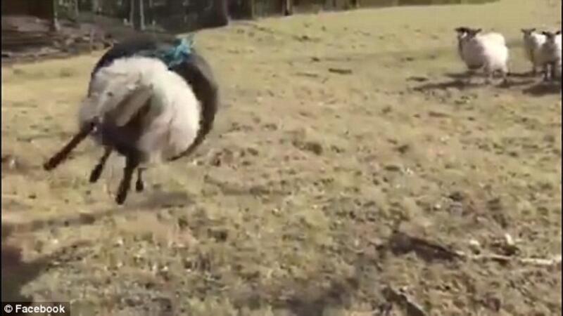 Posting on YouTube, the giggling man said: 'A sheep gets itself caught in a tyre swing and tries to get away but instead goes for a ride.'