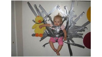 Saudi activists expressed disdain over a picture that showed a young child plastered against a wall with duct tape while an adult man slept on a couch underneath him “smiling.”