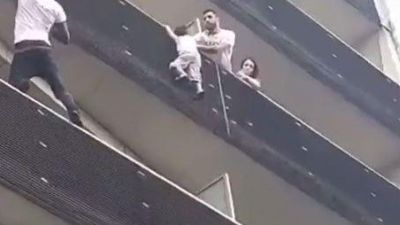 A Paris man on Sunday scaled four stories of a building to save a toddler that was hanging from a ledge.