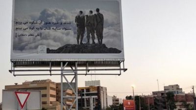 A billboard appeared in the Iranian city of Shiraz this week to commemorate the end of the war between Iran and Iraq in Sacred Defense Week. It depicted three soldiers, photographed from behind, standing on a hilltop.