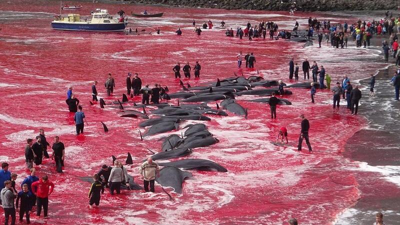 These images show dozens of villagers on a remote Atlantic island hunting down and slaughtering a pod of whales, colouring the water red with blood.
