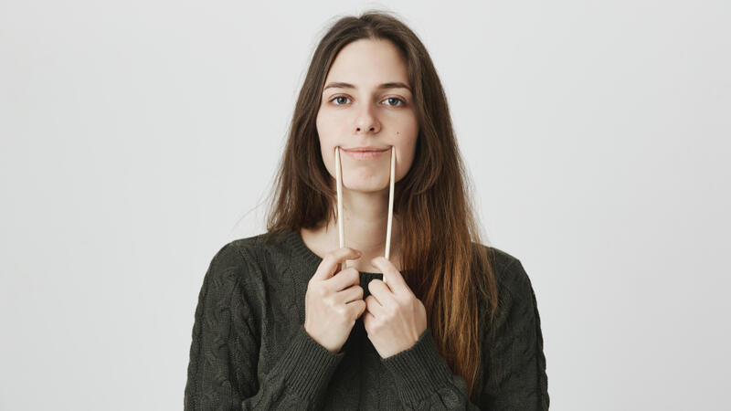 The use of a chopstick to create a smile is widespread in the service industry of the People’s Republic of China. The chopstick is placed as far back as possible to push up the corners of the mouth and display the teeth.