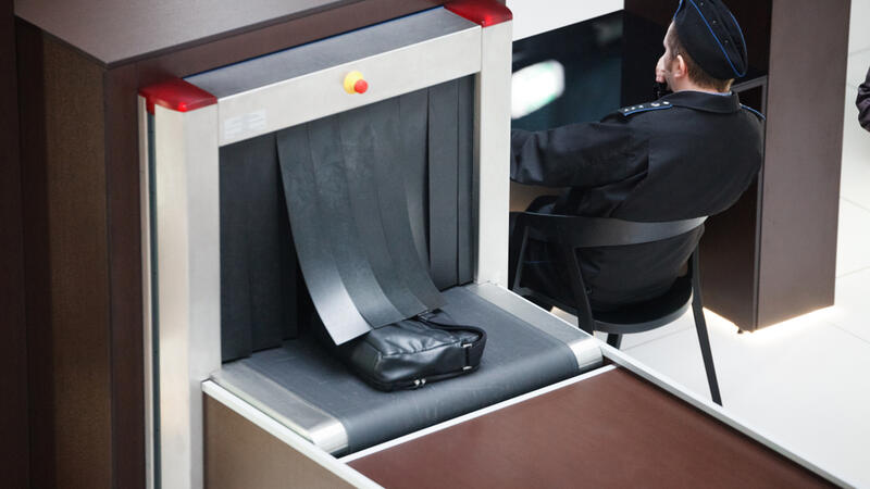 The man gets to the other side of the checkpoint and notices his son is missing. He turns to find the boy, who then crawls out of the luggage X-ray machine.