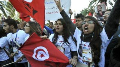Tunisian women shout slogans during a demostration in the center of Tunis after the opening of the World Social Forum (WSF) on March 26, 2013. More than two years after the Jasmine revolution, tens of thousands of people are expected for the WSF, dubbed the forum of "dignity", a watchword of the Tunisian uprising that inspired revolts across the Arab world. (AFP PHOTO/FETHI BELAID)