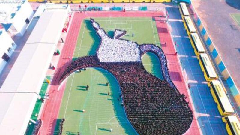 The 5,445 students at the Indian International School Sharjah formed the shape of a traditional Dallah coffee pot and transformed into the image of coffee being poured into a cup.