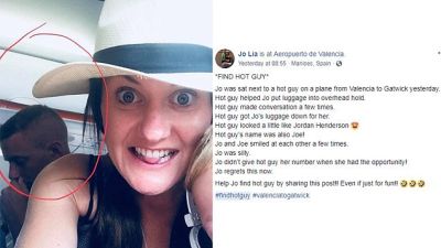 Jo posted: 'Jo was sat next to a hot guy on a plane from Valencia to Gatwick yesterday. Hot guy helped Jo put luggage into overhead hold. Hot guy made conversation a few times.