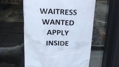Jamie Matthews, 34, photographed the notice printed on a piece of A4 paper, declaring: 'Waitress wanted, apply inside.'