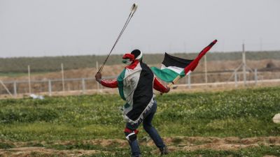 A Palestinian protester uses a slingshot during clashes with Israeli forces. (AFP/ File Photo)