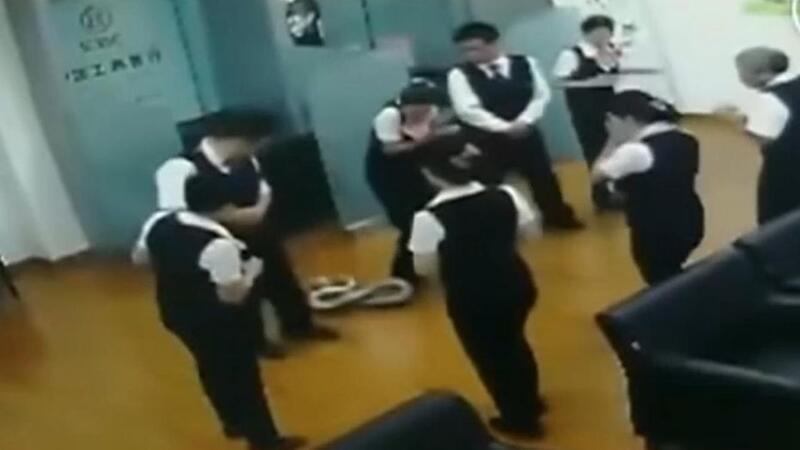 Security cameras were rolling inside a Chinese bank when a large python fell through the ceiling and caused employees to scatter.