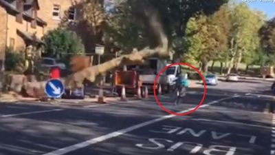 A shout can be heard as the huge tree suddenly starts to fall, and by some amazing piece of luck the cyclist manages to pass underneath moments before the tree crashes down onto the road.