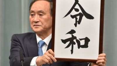Chief Cabinet Secretary Yoshihide Suga heralded the christening of Japan's next era by lifting up a board displaying the word written on it in kanji characters before a crowd of people gathered at the prime minister's office.