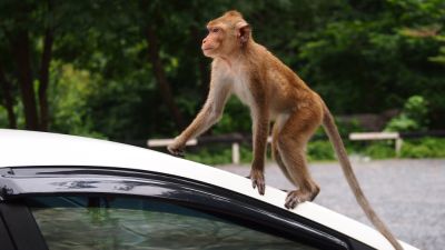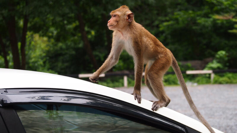 The monkey eventually pulls the plate free and climbs to the roof of the car to inspect its prize.