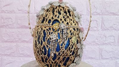 The egg is encased with an asymmetrical nest of 24k gold, valued at $250k, and the interior is lined with a silk Hermès scarf.