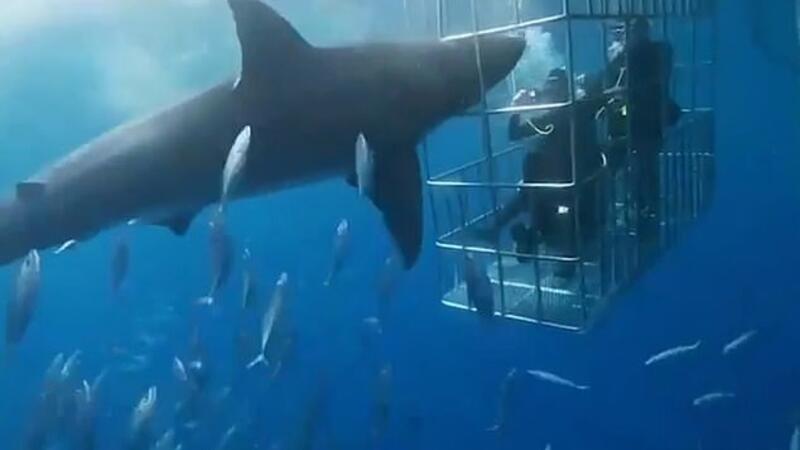 In the video, the huge shark, which is listed as Vulnerable on the IUCN Red List of Threatened Species, can be seen approaching the cage, which was hanging from the diving boat 'Nautilus', with at least four divers inside.