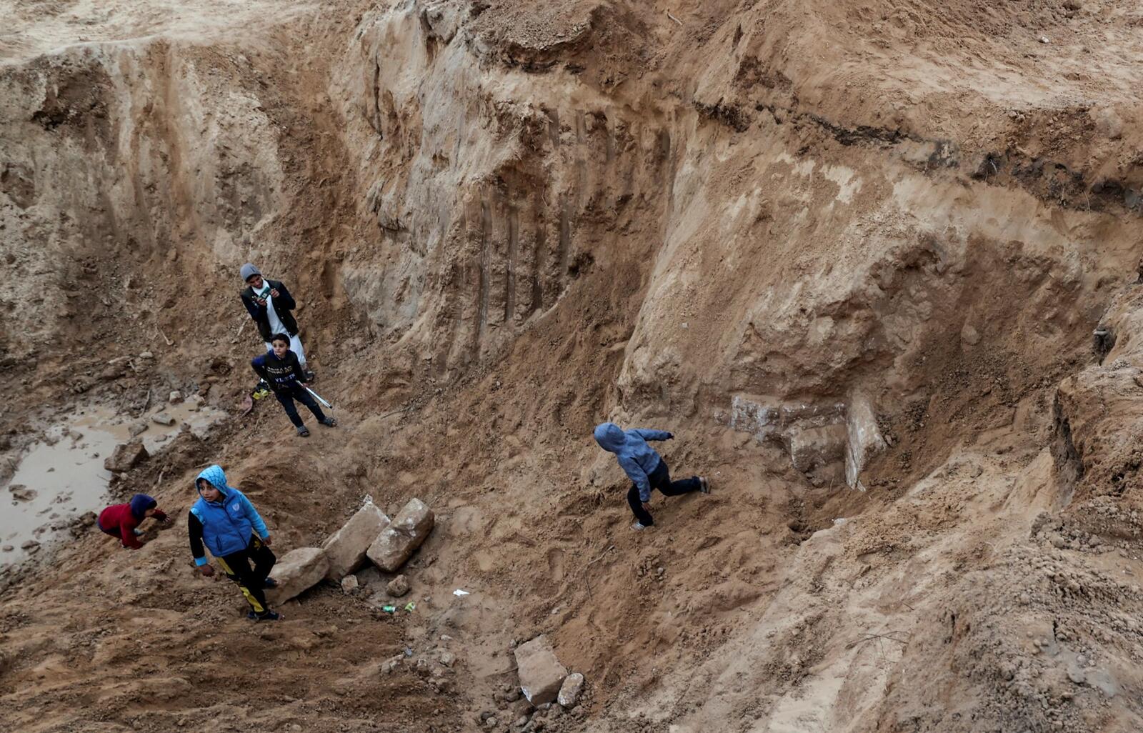 Palestinian boys play in an ancient cemetery reportedly dating back to the Roman-era which was unearthed during construction work in Gaza City on January 31, 2022. (Photo by Mahmud HAMS / AFP)