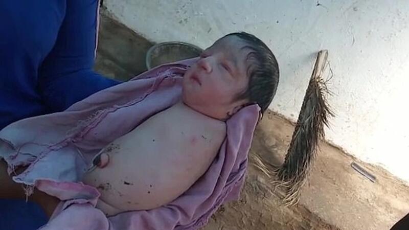 Footage shows a woman holding the baby which is missing both its arms and legs and is wrapped in a blanket.