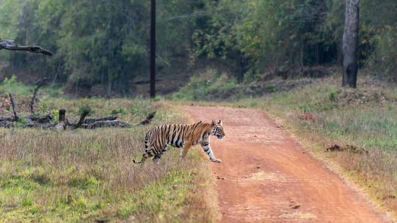 The deadly predator was pictured strolling across the busy road just feet away from the oncoming traffic in the Tadoba Andhari Tiger Reserve.