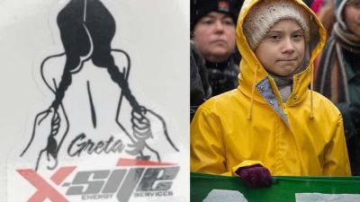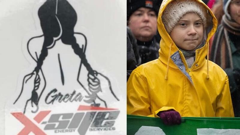 A sick cartoon depicting the rape of 17-year-old climate activist Greta Thunberg has sparked outrage at a Canadian oil accused of using the image on promotional stickers.