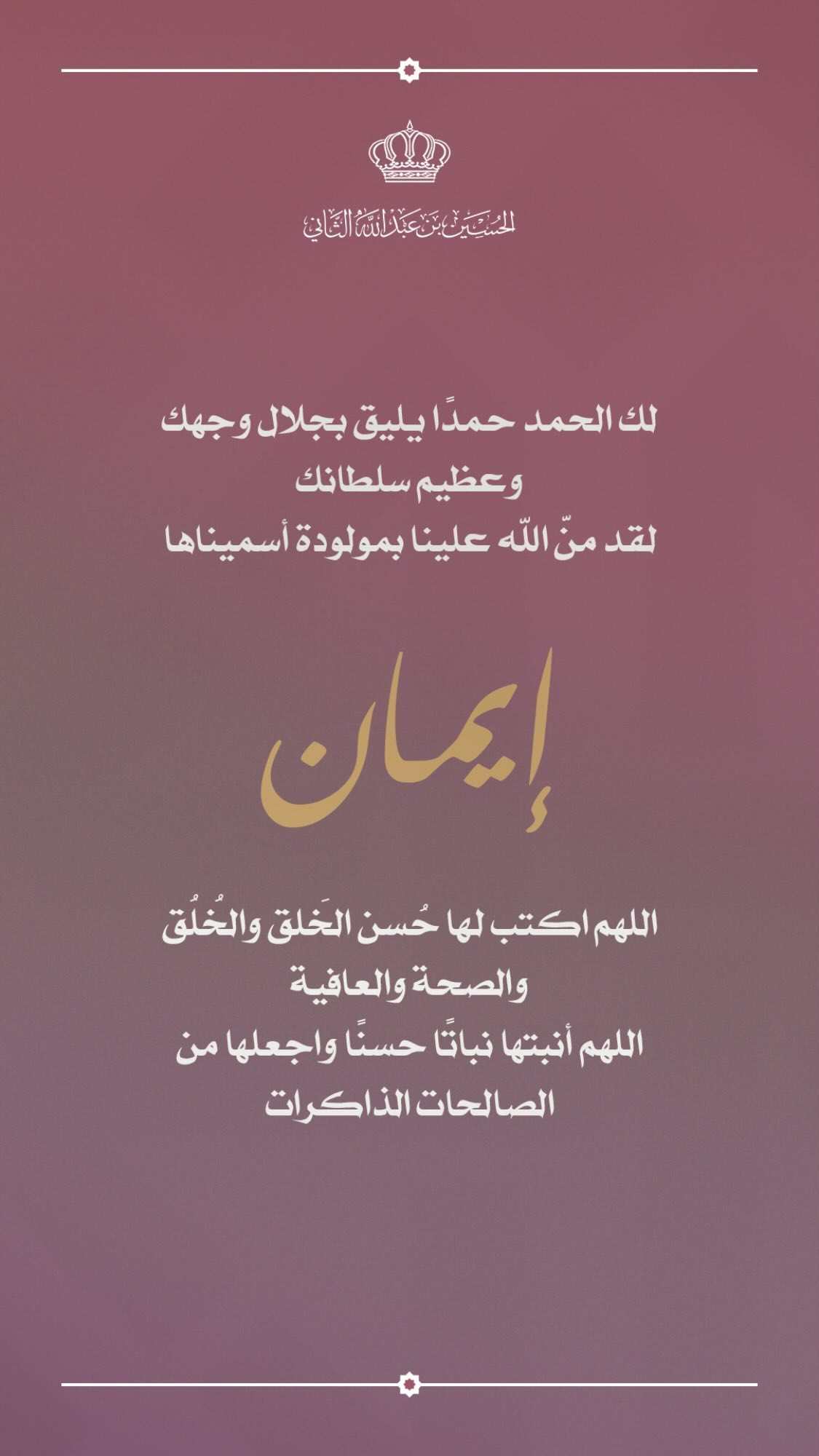The Royal Hashemite Court posted on X: "The Royal Hashemite Court is pleased to announce that Their Royal Highnesses Crown Prince Al Hussein bin Abdullah II and Princess Rajwa Al Hussein were blessed, on 3 August 2024, with a baby girl they named Iman."
