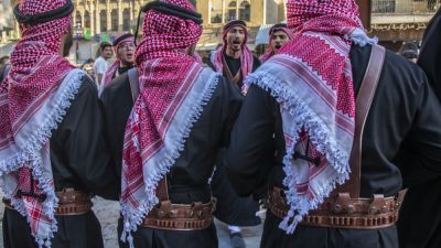 No country or religion has a monopoly on dabke. It is intrinsic to the culture and identity of Syria, Lebanon, Jordan and Palestine, and it is as vibrant today as it’s ever been. In Lebanon and Palestine alone there are multiple regional variations, which not only differ in tempo, but have different groove patterns and rhythm signatures. The dances, too, are varied, although a handful of styles form dabke’s traditional backbone. In the most popular, the dancers will be led by a lawweeh (waver), a charismatic improviser who controls both the tempo and the energy of the line.