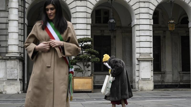 Turin mayor Chiara Appendino (L) stands at attention as an elderly woman walks past during a minute of silence at noon on March 31, 2020 in Turin as flags are being flown at half-mast in cities across Italy to commemorate the victims of the virus, during the country's lockdown aimed at curbing the spread of the COVID-19 infection, caused by the novel coronavirus. Marco BERTORELLO / AFP