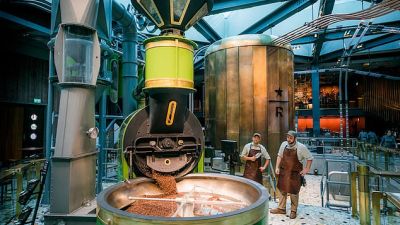 The green beans are processed in a 22ft bronze roasting cask that periodically unfolds like a blooming flower and rotates giving customers a rare glimpse of the de-gassing phase of the coffee bean roasting process.