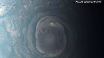 ALBAWABA A mysterious green light has been observed emanating from Jupiter, as captured by a spacecraft, scientists believe that this intriguing glow is the result of a lightning bolt near the planet's north pole.