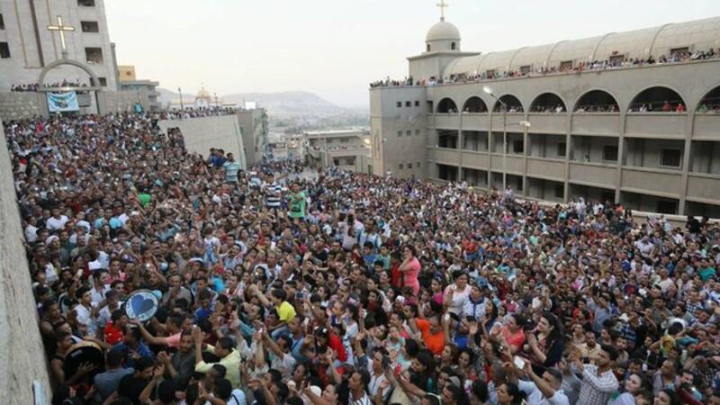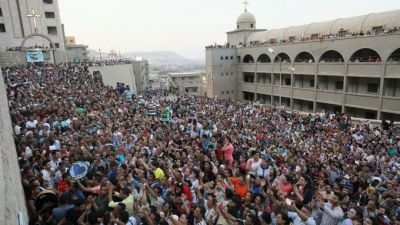 A zaffa (procession), deacons, priests and monks came out of the church during the ceremony that was led by Anba Yu'annis, bishop of Assiut. They went out from the ancient church bearing images of the Virgin Mary and crosses.