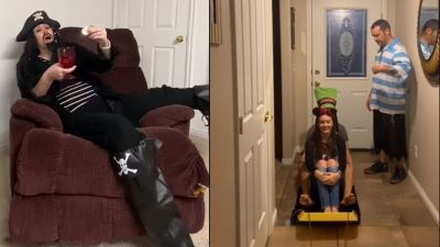 'We already had some pirate stuff from Halloween and such,' Brin explained to Syfy Wire. 'We are very familiar with the ride, so we picked out some of the key parts and brought it to life using items lying around the house.'