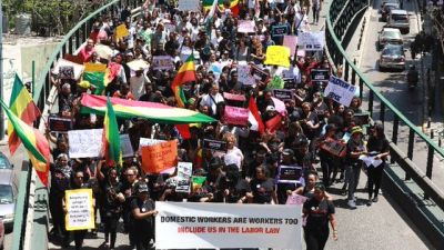 Hundreds of foreign domestic workers demonstrated in the Lebanese capital on Sunday to demand the scrapping of a sponsorship system that they complain leaves them open to abuse from employers.
