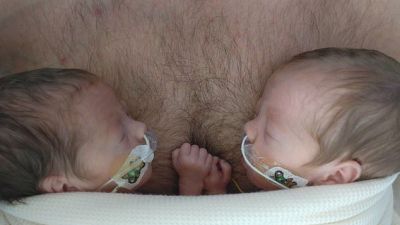 The men drove three-and-a-half hours to the hospital and made it in time to see their daughters being wheeled into neonatal intensive care, where they remained for several weeks.