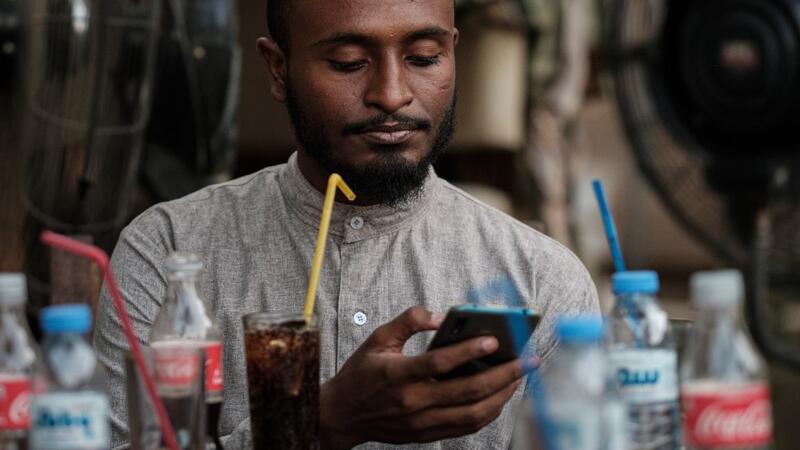 Sudanese Mohamed Omar, 25, uses his smart phone to access the internet a cafe in which an hour of internet costs 50 Sudanese pounds, which is approximately one US dollar, on June 17, 2019. (AFP/ File Photo)