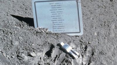 Photo: “Fallen Astronaut” statue and a name plaque on the surface of the Moon.