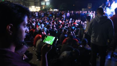 In the southern city of Nasiriyah, where protesters have been engaged in daily confrontations with security forces, protesters also set up a large screen in Haboub Square to watch the game.