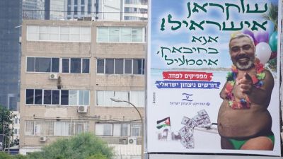 The billboard, which was put up on a widely used highway in Tel Aviv depicted Hamas leader Ismail Haniyeh photoshopped in speedos and a Hawaiian lei.