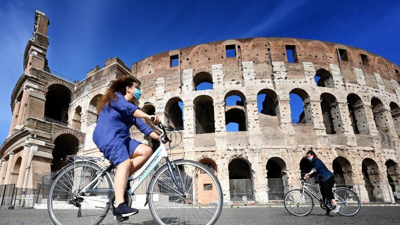 The public came out of their homes across the nation during Phase Two of lockdown, with people taking to their bicycles around the Piazza Venezia and the Via dei Fori Imperiali in the capital.