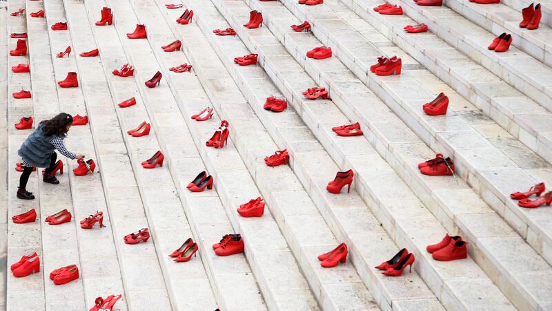A girl puts flowers at an installation of women's red shoes displayed on staircase, as a symbol to denounce violence against women, at Durresi main square in Tirana, on International Women's Day, on March 8, 2021. / AFP / Gent SHKULLAKU