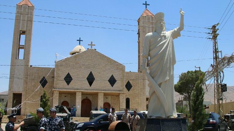 Lebanese soldiers stand guard in front of a church where a suicide bomber blew himself up the previous day in the Christian village of Al-Qaa, on June 28, 2016 (AFP Photo/)