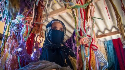 A Moroccan rug weaver sorts out yarn at a workshop in the city of Sale, north of the capital Rabat, on June 3, 2020, during the novel coronavirus pandemic. Artisans in Morocco have been starved of income for almost three months because of the COVID-19 pandemic. The crafts industry represents some seven percent of GDP, with an export turnover last year of nearly 1 billion dirhams ($100 million). FADEL SENNA / AFP